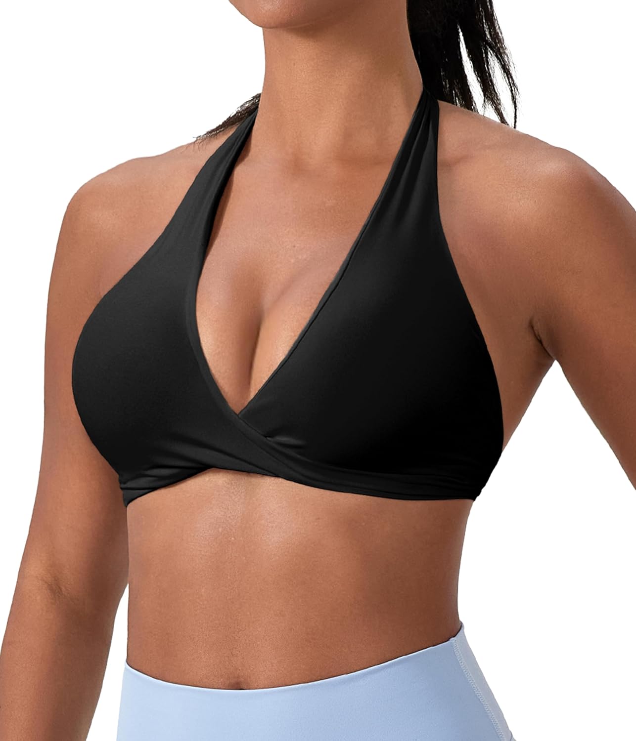- 🧡HALTER OPEN BACK WORKOUT BRA🧡: High stretchy halter neck workout crop tops features a front design. The chic deep v neck elegantly highlights your flattering bust shape. Sexy open back shows your beautiful back muscles. Cute gym bra with 1″ elastic band at the bottom, stay put and provide more supprort. Perfect fit for all shapes